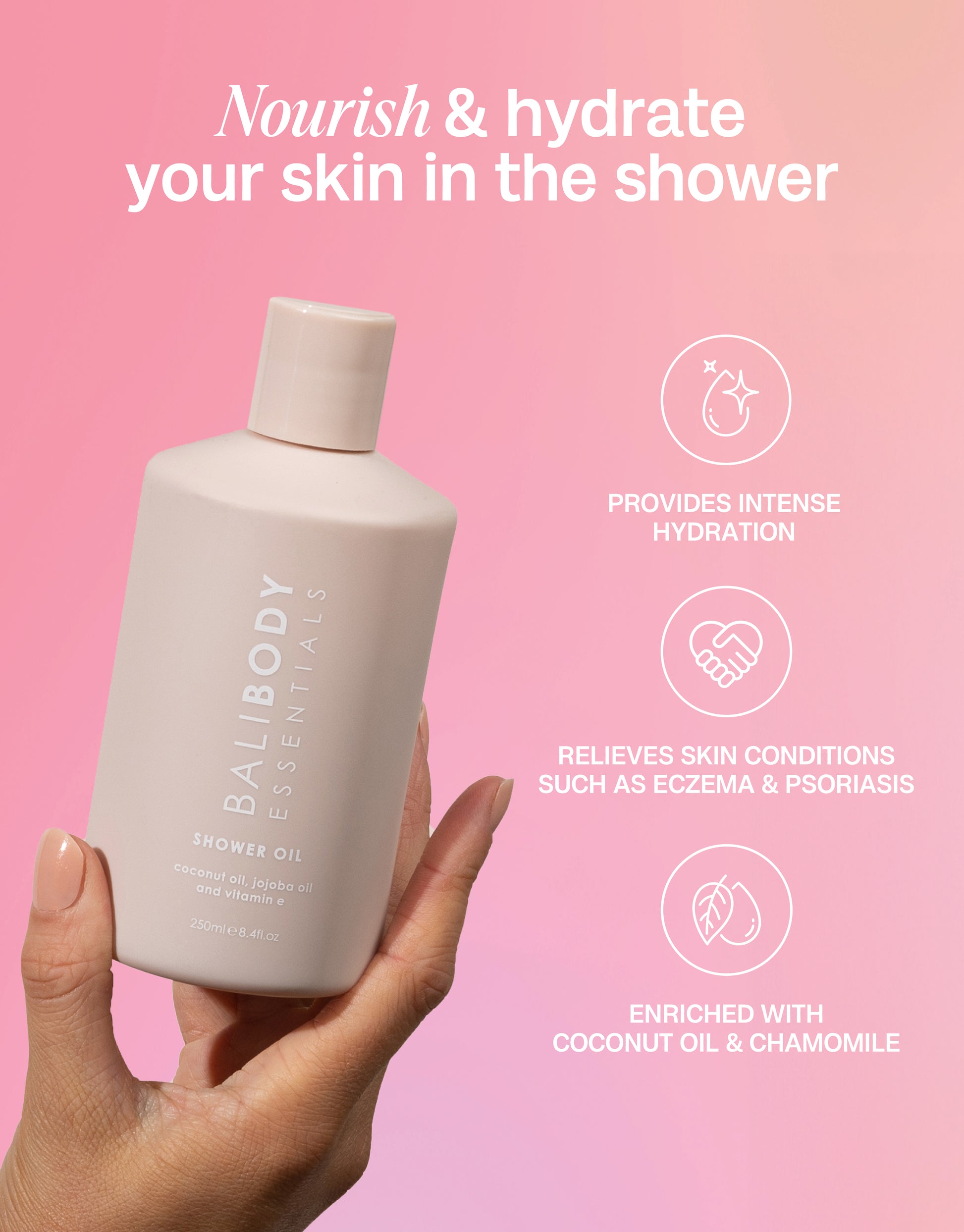The benefits of incorporating a shower oil into your shower routine is added hydration, additional skin nourishment and letting the formula smooth and even out general skin tone.