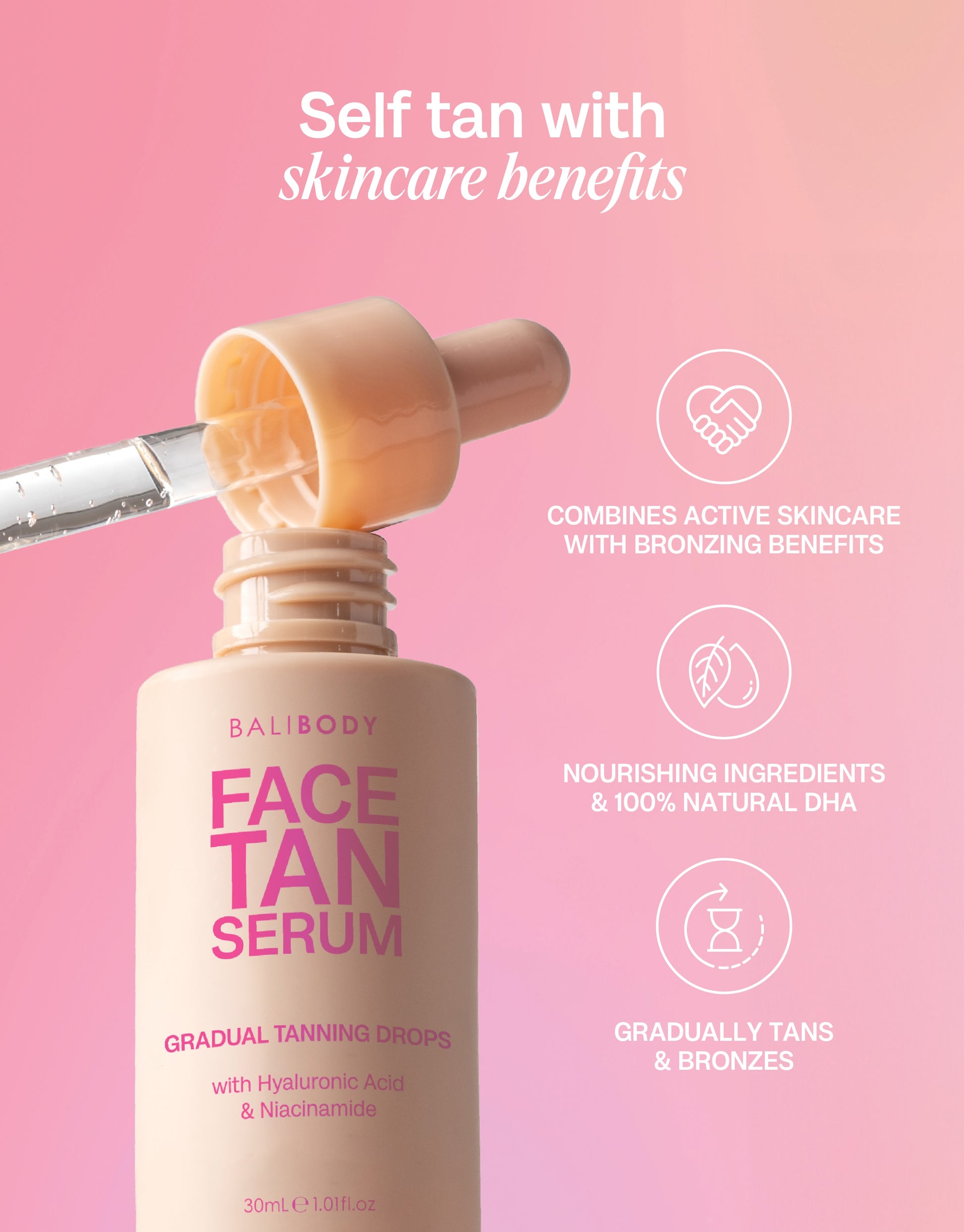 Formulated with 100% natural DHA and a powerful blend of skincare ingredients, our Face Tan Serum promises a bronzed and glowing result without irritating skin or blocking pores.Niacinamide and hyaluronic acid work together to decrease the appearance of fine lines and wrinkles, while also reducing pigmentation and skin blemishes. Hydration and anti-inflammatory benefits can be found with the inclusion of jojoba and coconut oil, allowing you to enjoy a truly radiant, hydrated and nourished complexion all year round.