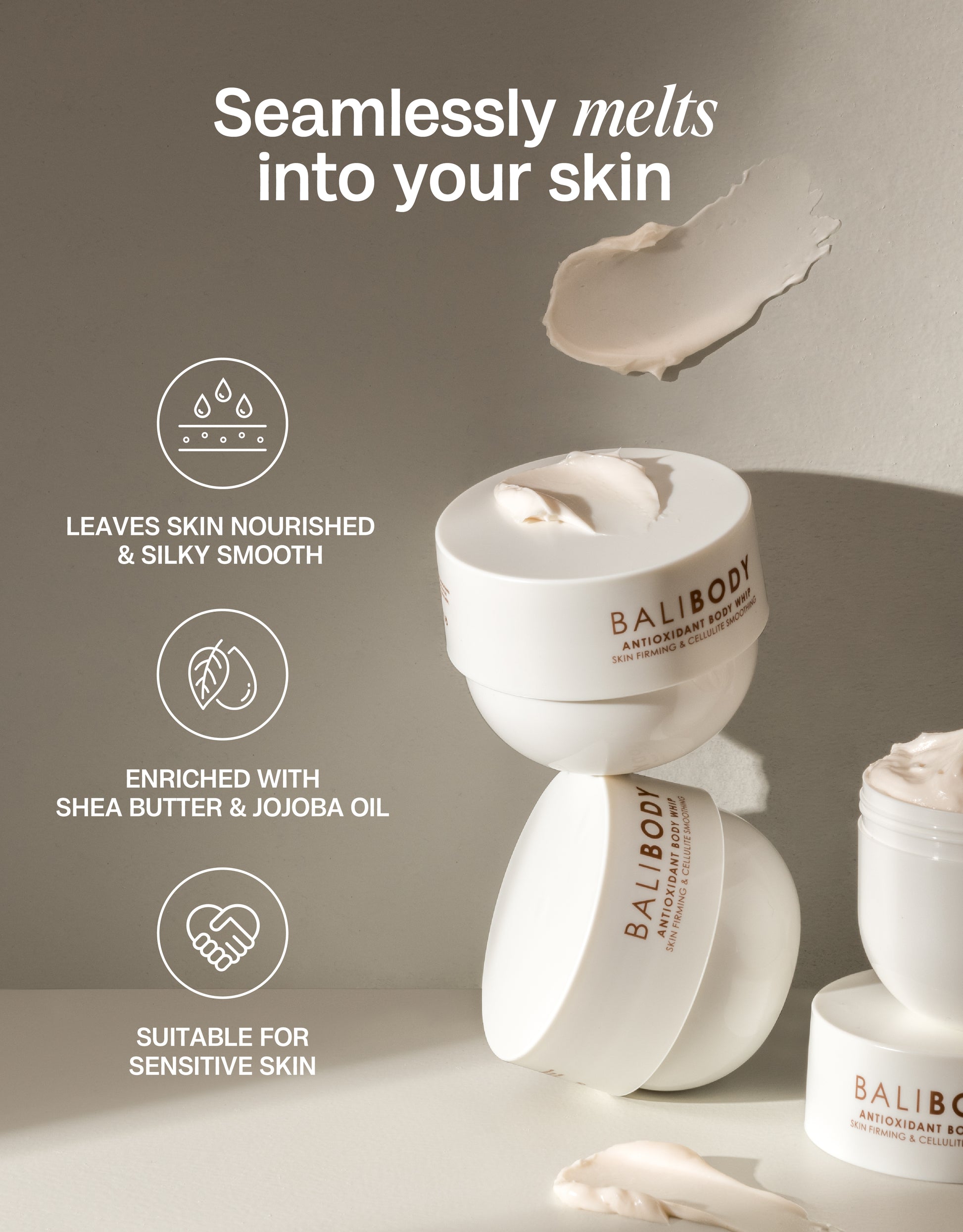 Our Antioxidant Body Whip is designed to melt into your skin, promising a smooth, firm, supple appearance.
