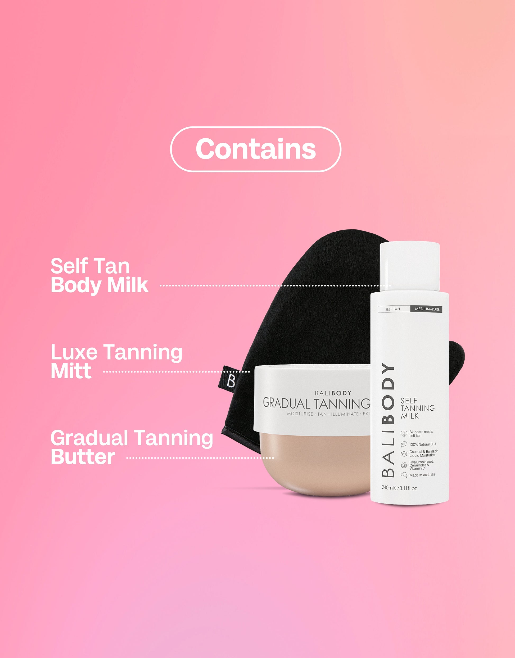 Treat yourself to glowing skin with the Radiant Recipe bundle. These creamy, dreamy and deliciously nourishing formulas will gradually develop a natural looking bronze while hydrating your skin.