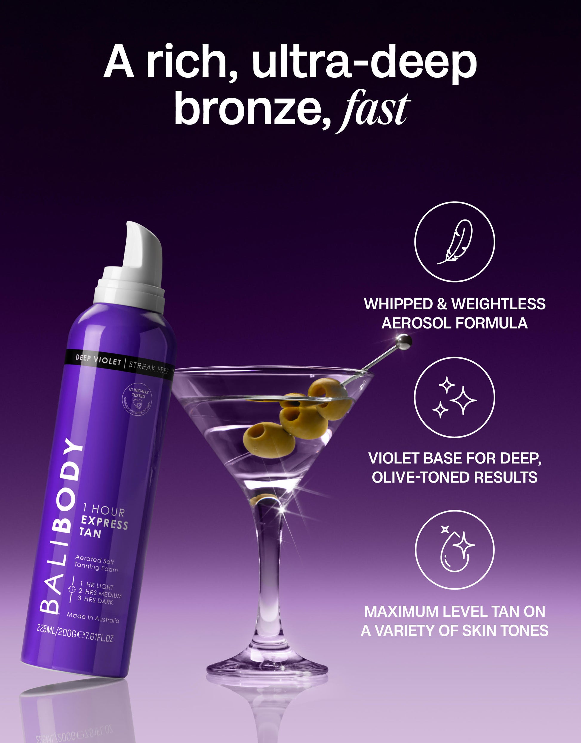 Fast track achieving deep, rich, olive-toned results with Violet Express Self Tan.